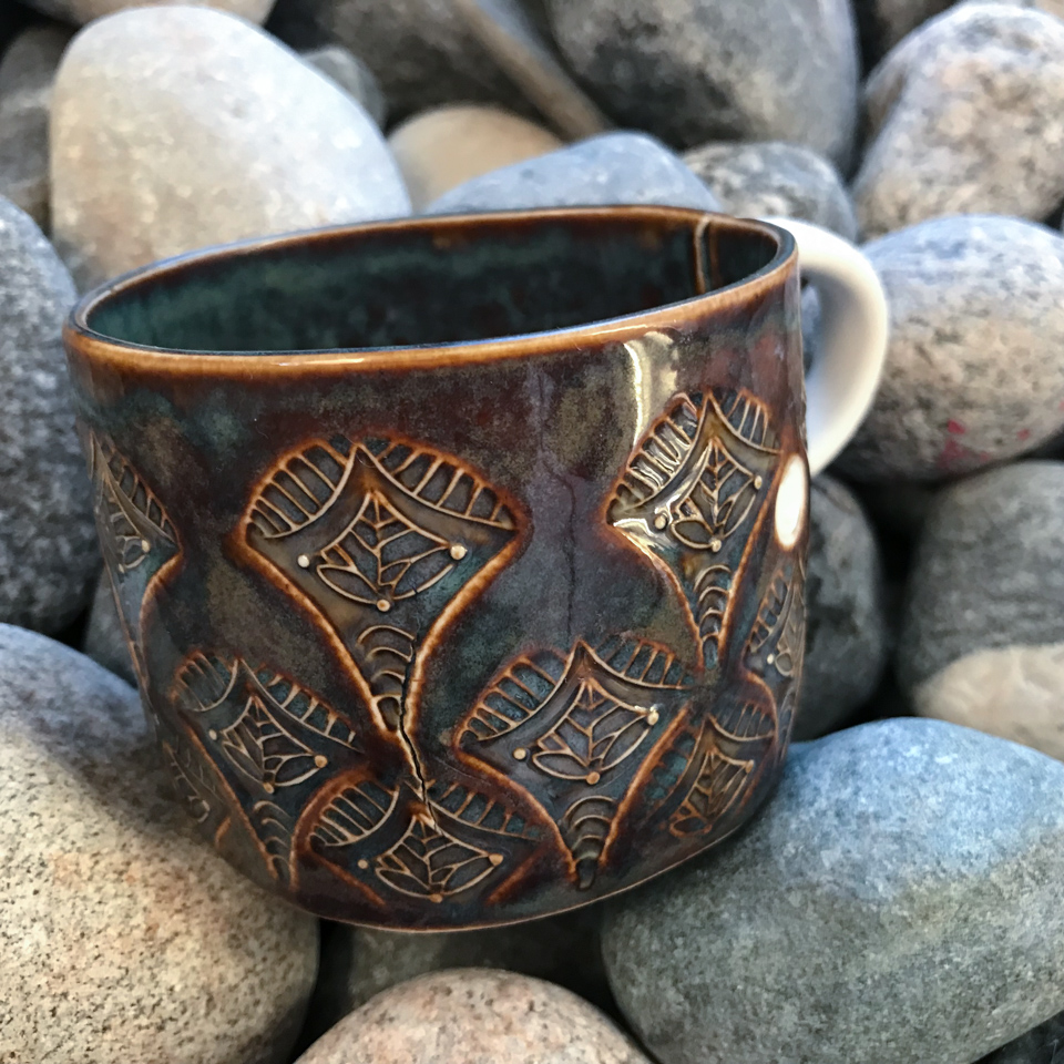 Pruunikas, kergelt sinika varjundiga glasuur toob mustri hästi esile.